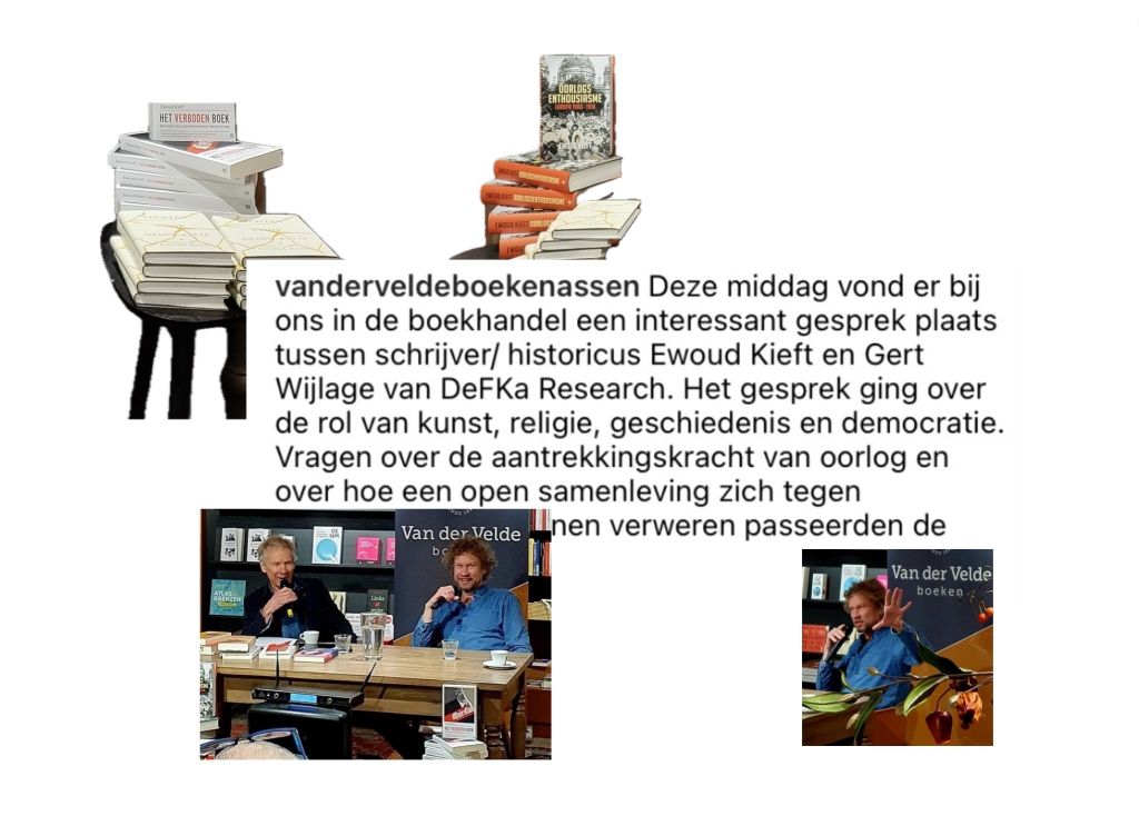 Het interview gisteren 25/2 met schrijver en historicus Ewoud Kieft verliep langs chronologische volgorde van zijn publicaties sinds de uitgave Oorlogsenthousiasme. Dit uitmuntende boek over het militantisme onder kunstenaars en wetenschappers tussen 1870 en 1914 geeft een kritisch overzicht van de Europese situatie in dat tijdperk. Een overzicht, ondersteunt door veelvuldig bronnenonderzoek, dat een goede aanvulling is op de doorsnee kunsthistorische stijlgeschiedenis. Van daaruit kwam het gesprek op de precaire verhouding tussen esthetische autonomie en ethisch-maatschappelijke receptie, destijds en in het heden. Zijn roman de Onvolmaakten maakte een discussie los over de gevaren en geneugten (moderne afhankelijkheid) van technologie en artificiële intelligentie. Daarmee kwam ook meteen de gemengde rol van schrijver-historicus aan de orde ten opzichte van disciplines wetenschap-literatuur. De volgende kleine stap betrof ook precies hoe en waar zijn meest recente boek ‘vechten voor democratie’ te plaatsen. Suggestie: verplichte stof in het onderwijs vanaf de lagere school. Na de pauze werd hier op humanistisch-politieke wijze verder gespeculeerd. Bijvoorbeeld: hoe krijgen we oplossingen door burgerraden aangedragen ook werkelijk uitgevoerd, mede in het licht van de macht van multinationals. Tweede suggestie: polemiseer en mijdt de eerlijke confrontatie niet.